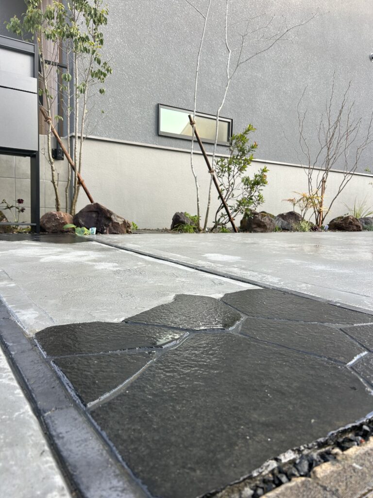 コンクリート部分はあえてコテムラ仕上げにすることで、無機質になりすぎず、柔らかさのある外構に仕上げています。